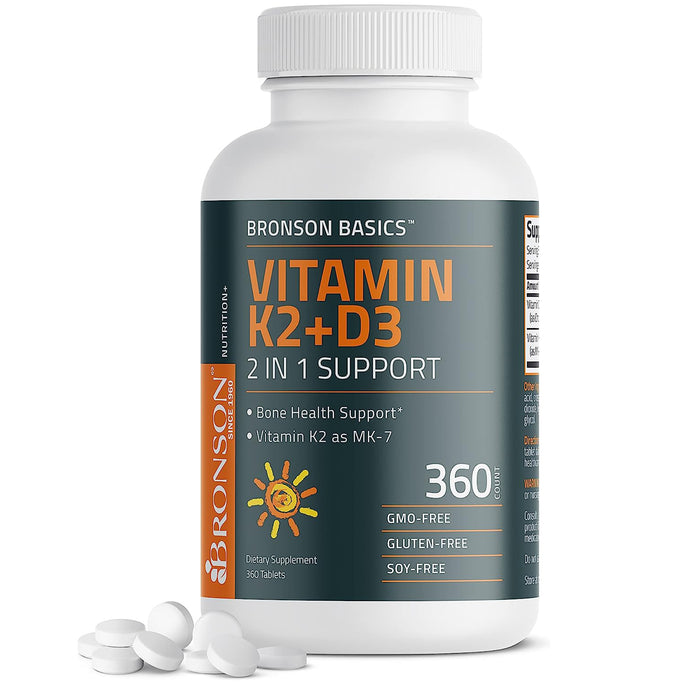 - Bone & Immune Health: Vitamin K2 & D3 were simply meant to be together. While the benefits of Vitamin D are well known, many don’t realize that Vitamin D utilizes Vitamin K2 to maximize its benefits. Bronson Basics K2 + D3 provides Vitamin K2 as MK-7, which promotes enhanced absorption compared to other forms of Vitamin K.