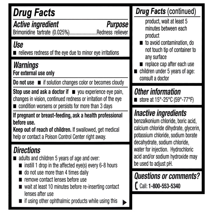 Active Ingredients: Brimonidine Tartrate - 0.025 % (Redness reliever) - Inactive Ingredients: benzalkonium chloride, boric acid, calcium chloride dihydrate, glycerin, potassium chloride, sodium borate decahydrate, sodium chloride, water for injections, Hydrochloric acid and or sodium hydroxide may be used to adjust pH