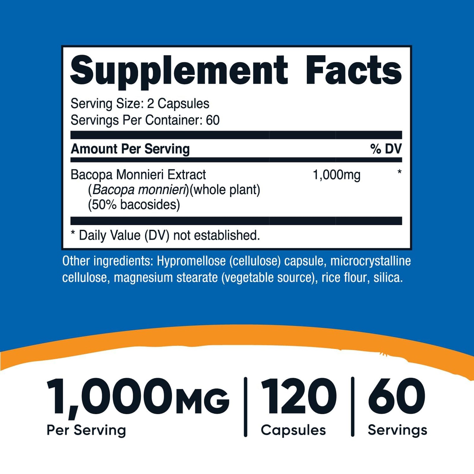 Nutricost Bacopa Monnieri 1,000mg, 120 Capsules (60 Servings) - Non-GMO, Gluten Free, and Vegetarian Friendly